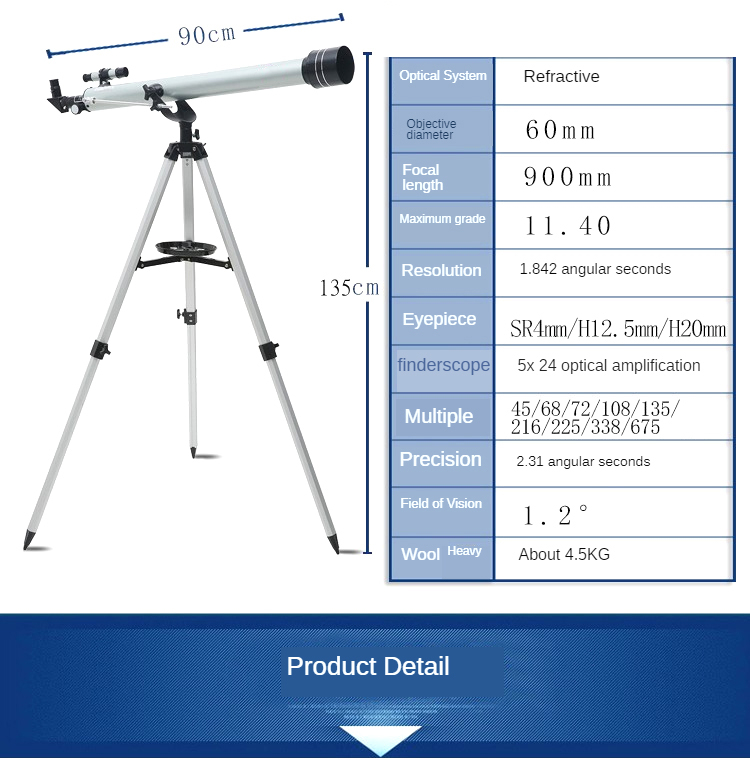 Kính thiên văn khúc xạ F90060 có độ chính xác quang học cao, được thiết kế cẩn thận trong từng chi tiết, làm đơn giản hóa việc quan sát thiên văn đến mức tối đa, với kính viễn vọng là tuyệt vời để bắt đầu quan sát bầu trời. Có thân ống kính làm bằng hợp kim nhôm nhẹ và chắc chắn, bộ vật kính tiêu sắc được tráng phủ chống phản quang toàn phần cho hình ảnh sáng, trong và sắc nét.