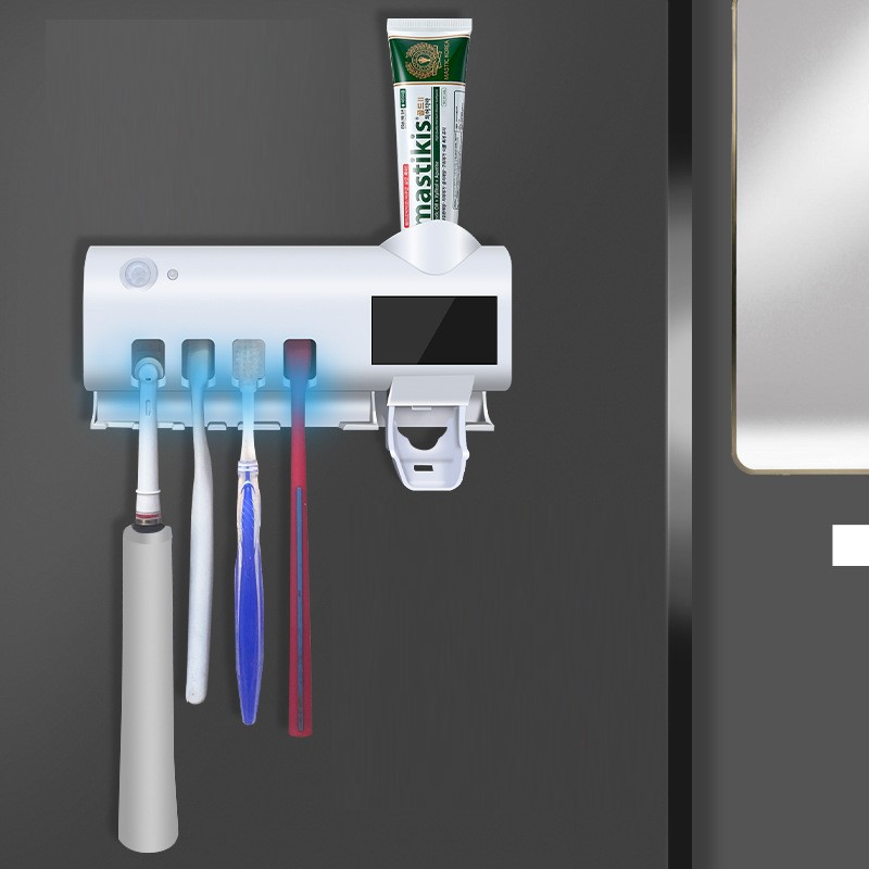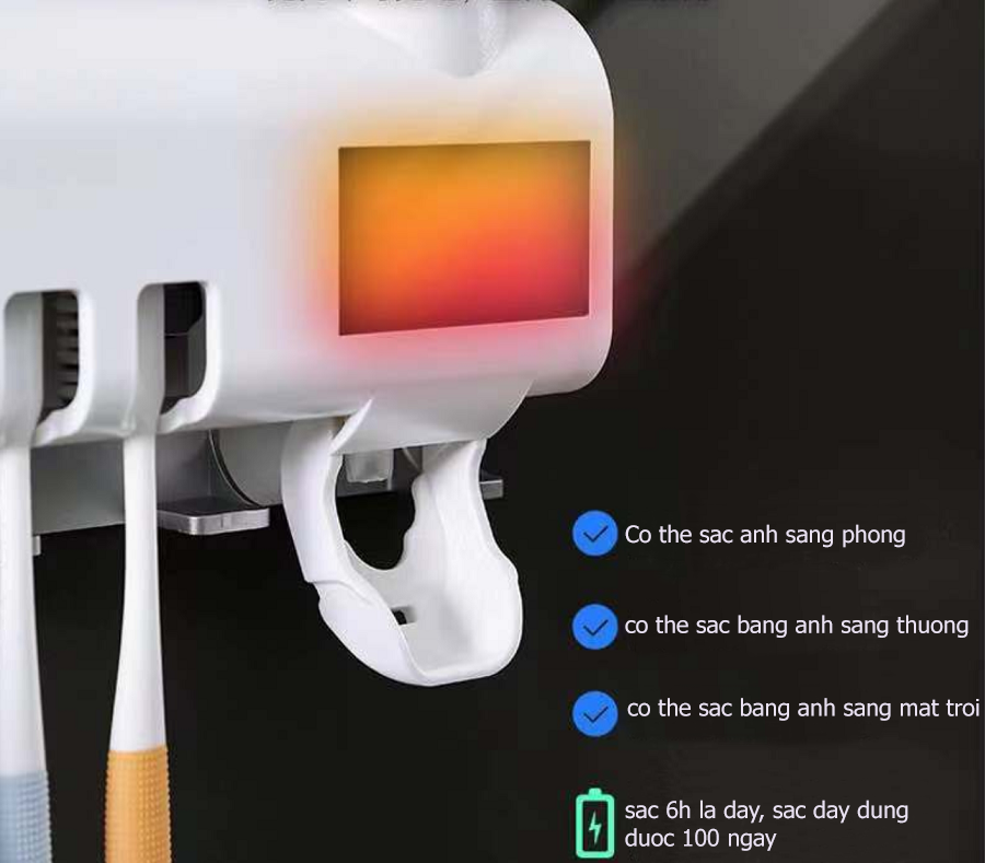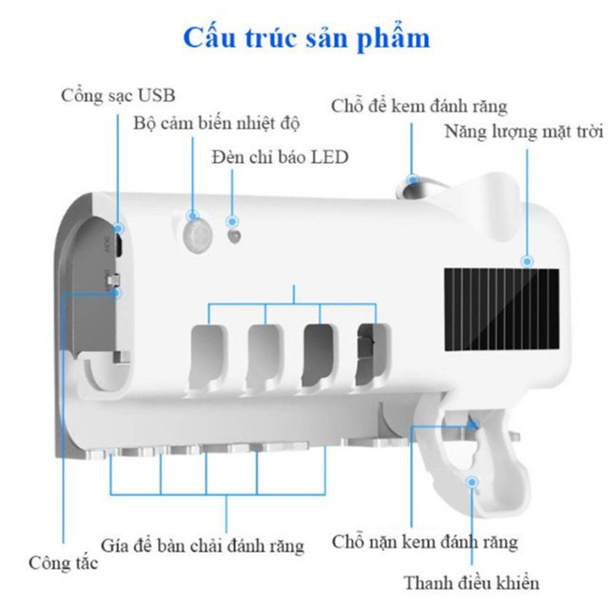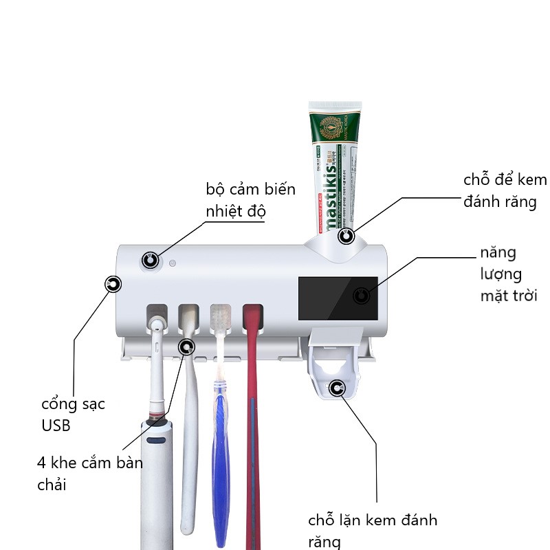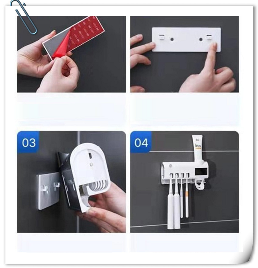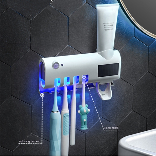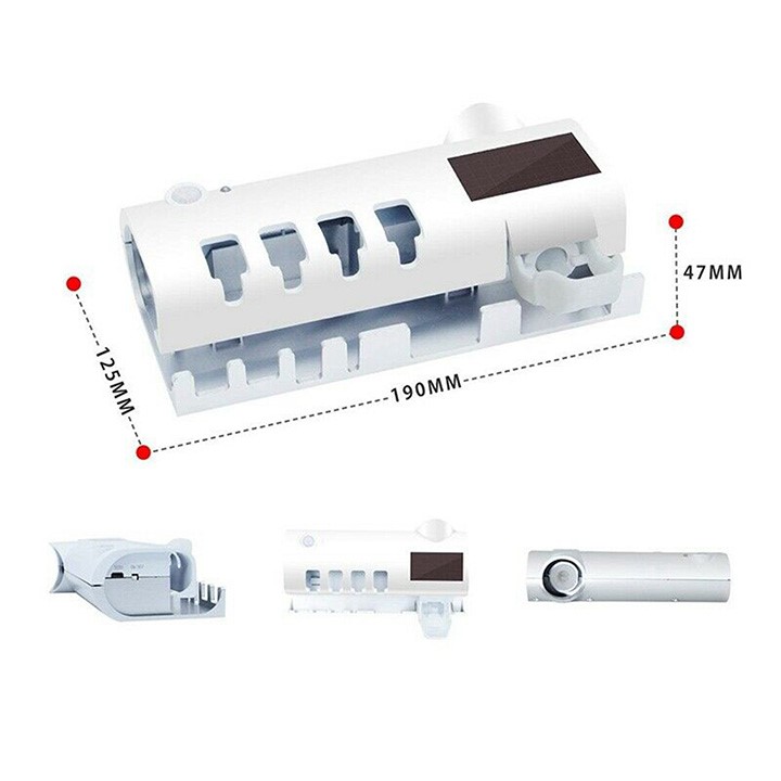 Máy tiệt trùng bàn chải đánh răng bằng tia UV. sở hữu thiết kế tối giản cùng. Kích thước nhỏ gọn cùng trọng lượng nhẹ sẽ không chiếm nhiều diện tích, tiện lợi để người dùng mang theo sử dụng khi đi công tác. với 4 khe cắm bàn chải, 1 khe lấy kem tự động rất thuận lợi và tiết kiệm không gian cho cả gia đình bạn. Chất liệu máy được làm bằng nhựa ABS vô cùng chắc chắn cùng màu sơn trắng rất đẹp mắt. Sản phẩm đi kèm bao gồm miếng dán 3M cực kì chắc chắn để bạn dán sản phẩm vào tường mà không cần đụt khoan tường.